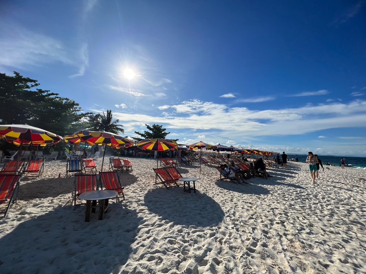 Limestone cliffs surround and emerald lagoon white sand Beach fringed with palm trees crystal sea water.