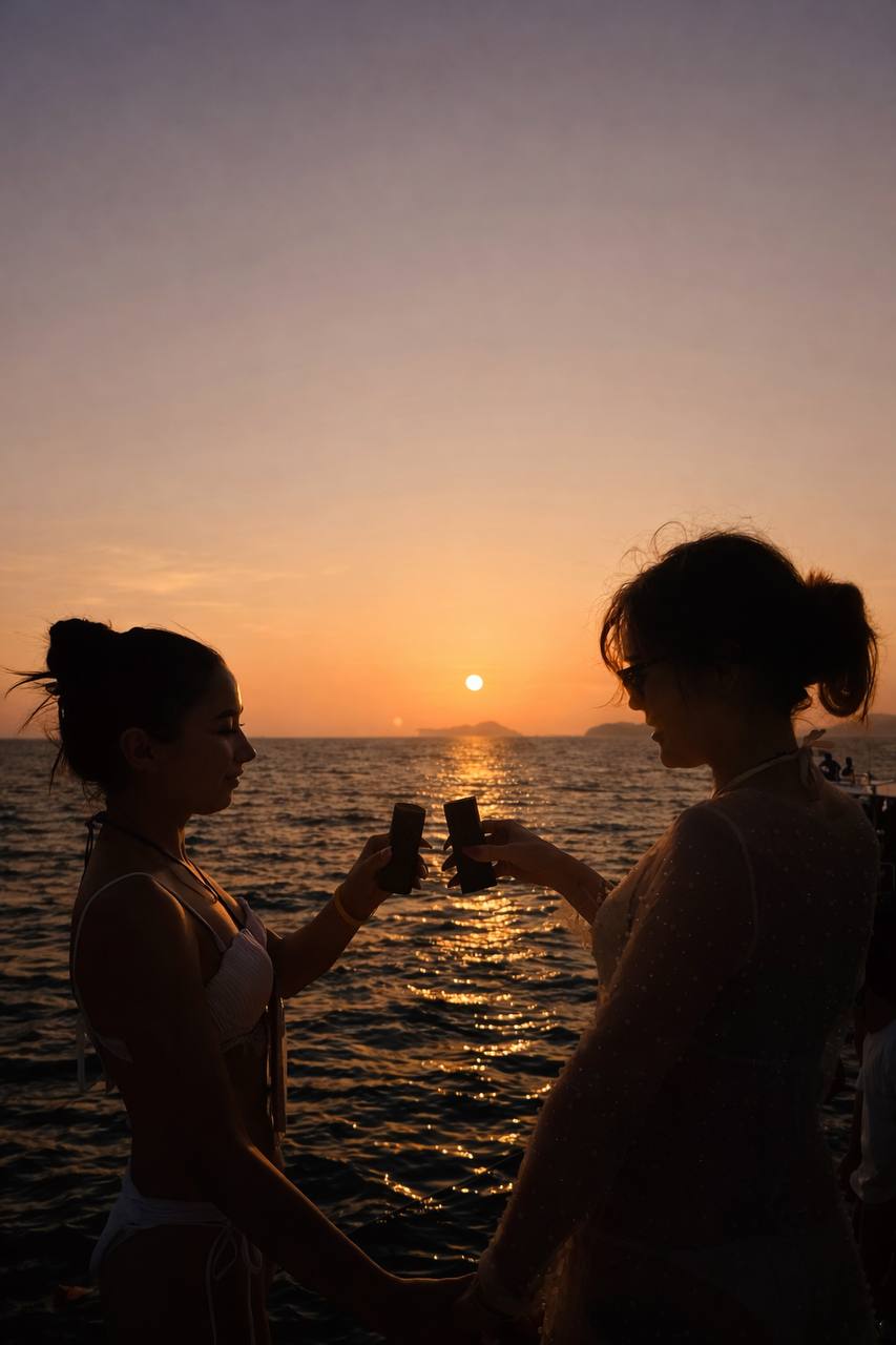 Большое островное путешествие на премиум-катамаране, где каждый этап — как отдельный вау-момент: утренний релакс на Рача Яй без толп, культовые локации Пхи-Пхи и финал в формате Sunset Chill Party у острова Майтон — с музыкой, купанием и закатом, который хочется запомнить навсегда.